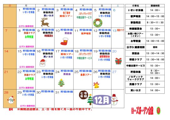 ローズガーデン倉敷日記 TOPページ > ローズガーデン倉敷日記 > 月間予定表 > 12月 2025.11.28 (Fri)|月間予定表 新着情報 12月 ダウンロードPDFファイル 約353KB ※画像をクリックすると、PDFファイルが開き、詳細をご覧いただけます。 ※PDFファイルの閲覧にはアクロバットリーダー(無料)が必要です。 下のリンクからダウンロードしてください。 2025年12月 月 火 水 木 金 土 日 1 2345678 9101112131415 16171819202122 23242526272829 30 « 11月 ⇒旧ブログはこちら カテゴリー 月間予定表 新着情報 ブログ ローズガーデン倉敷ニュース 最近の投稿 12月 おでかけ食事ツアー 香川県に行ってきました ノルディックウォーク 酒津公園遠征に行きました お食事ツアー「くらしき茶寮」に行きました。 11月 9月10月11月 合同誕生会 10月 9月 お食事ツアーでフレンチレストラン「EYOHAKU」へ行って来ました 6月7月8月 合同誕生会 月別アーカイブ 2025年11月 2025年10月 2025年9月 2025年8月 2025年7月 2025年6月 2025年5月 2025年4月 2025年3月 2025年2月 2025年1月 2024年12月 2024年11月 2024年10月 2024年9月 2024年8月 2024年7月 2024年6月 2024年5月 2024年4月 2024年3月 2024年2月 2024年1月 2023年12月 2023年11月 2023年10月 2023年9月 2023年8月 2023年7月 2023年6月 2023年5月 2023年4月 2023年3月 2023年2月 2023年1月 2022年12月 2022年11月 2022年10月 2022年9月 2022年8月 2022年7月 2022年6月 2022年5月 2022年4月 2022年3月 2022年2月 2022年1月 2021年12月 2021年11月 2021年10月 2021年9月 2021年8月 2021年7月 2021年6月 2021年5月 2021年4月 2021年3月 2021年2月 2021年1月 2020年12月 2020年11月 2020年10月 2020年9月 2020年8月 2020年7月 2020年6月 2020年5月 2020年4月 2020年3月 2020年2月 2020年1月 2019年12月 2019年11月 2019年10月 2019年9月 2019年8月 2019年6月 2019年5月 2019年4月 2019年3月 2019年2月 2019年1月 2018年12月 2018年11月 2018年10月 2018年9月 2018年8月 2018年7月 2018年6月 2018年5月 2018年4月 2018年3月 2018年2月 2018年1月 2017年12月 2017年11月 2017年10月 2017年9月 2017年8月 2017年7月 2017年6月 2017年5月 2017年4月 2017年3月 2017年2月 2017年1月 2016年12月 2016年11月 2016年4月 2015年4月 2014年4月 2013年4月 2012年4月 2011年4月 2010年4月 2008年4月 2007年4月 2006年9月 2006年3月