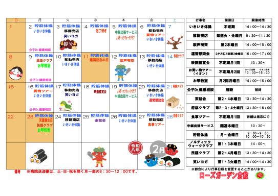 ローズガーデン倉敷日記 TOPページ > ローズガーデン倉敷日記 > 2026年 > 1月 2026.01.23 (Fri)|月間予定表 2月 ダウンロードPDFファイル 約381KB ※画像をクリックすると、PDFファイルが開き、詳細をご覧いただけます。 ※PDFファイルの閲覧にはアクロバットリーダー(無料)が必要です。 下のリンクからダウンロードしてください。 ‹ 1 › 2025年1月 月 火 水 木 金 土 日 12345 6789101112 13141516171819 20212223242526 2728293031 « 12月 ⇒旧ブログはこちら カテゴリー 月間予定表 新着情報 ブログ ローズガーデン倉敷ニュース 最近の投稿 2月 お食事ツアーで「レストラン蔦」へ行って来ました 1月 12月 おでかけ食事ツアー 香川県に行ってきました ノルディックウォーク 酒津公園遠征に行きました お食事ツアー「くらしき茶寮」に行きました。 11月 9月10月11月 合同誕生会 10月 月別アーカイブ 2026年1月 2025年12月 2025年11月 2025年10月 2025年9月 2025年8月 2025年7月 2025年6月 2025年5月 2025年4月 2025年3月 2025年2月 2025年1月 2024年12月 2024年11月 2024年10月 2024年9月 2024年8月 2024年7月 2024年6月 2024年5月 2024年4月 2024年3月 2024年2月 2024年1月 2023年12月 2023年11月 2023年10月 2023年9月 2023年8月 2023年7月 2023年6月 2023年5月 2023年4月 2023年3月 2023年2月 2023年1月 2022年12月 2022年11月 2022年10月 2022年9月 2022年8月 2022年7月 2022年6月 2022年5月 2022年4月 2022年3月 2022年2月 2022年1月 2021年12月 2021年11月 2021年10月 2021年9月 2021年8月 2021年7月 2021年6月 2021年5月 2021年4月 2021年3月 2021年2月 2021年1月 2020年12月 2020年11月 2020年10月 2020年9月 2020年8月 2020年7月 2020年6月 2020年5月 2020年4月 2020年3月 2020年2月 2020年1月 2019年12月 2019年11月 2019年10月 2019年9月 2019年8月 2019年6月 2019年5月 2019年4月 2019年3月 2019年2月 2019年1月 2018年12月 2018年11月 2018年10月 2018年9月 2018年8月 2018年7月 2018年6月 2018年5月 2018年4月 2018年3月 2018年2月 2018年1月 2017年12月 2017年11月 2017年10月 2017年9月 2017年8月 2017年7月 2017年6月 2017年5月 2017年4月 2017年3月 2017年2月 2017年1月 2016年12月 2016年11月 2016年4月 2015年4月 2014年4月 2013年4月 2012年4月 2011年4月 2010年4月 2008年4月 2007年4月 2006年9月 2006年3月