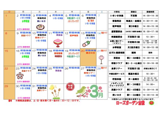 ローズガーデン倉敷日記 TOPページ > ローズガーデン倉敷日記 > 2026年 > 2月 2026.02.20 (Fri)|月間予定表 新着情報 3月 ダウンロードPDFファイル 約379KB ※画像をクリックすると、PDFファイルが開き、詳細をご覧いただけます。 ※PDFファイルの閲覧にはアクロバットリーダー(無料)が必要です。 下のリンクからダウンロードしてください。 ‹ 1 › 2026年2月 月 火 水 木 金 土 日 12 3456789 10111213141516 17181920212223 24252627282930 31 « 1月 ⇒旧ブログはこちら カテゴリー 月間予定表 新着情報 ブログ ローズガーデン倉敷ニュース 最近の投稿 3月 お食事ツアー かに道楽 2月 お食事ツアーで「レストラン蔦」へ行って来ました 1月 12月 おでかけ食事ツアー 香川県に行ってきました ノルディックウォーク 酒津公園遠征に行きました お食事ツアー「くらしき茶寮」に行きました。 11月 月別アーカイブ 2026年2月 2026年1月 2025年12月 2025年11月 2025年10月 2025年9月 2025年8月 2025年7月 2025年6月 2025年5月 2025年4月 2025年3月 2025年2月 2025年1月 2024年12月 2024年11月 2024年10月 2024年9月 2024年8月 2024年7月 2024年6月 2024年5月 2024年4月 2024年3月 2024年2月 2024年1月 2023年12月 2023年11月 2023年10月 2023年9月 2023年8月 2023年7月 2023年6月 2023年5月 2023年4月 2023年3月 2023年2月 2023年1月 2022年12月 2022年11月 2022年10月 2022年9月 2022年8月 2022年7月 2022年6月 2022年5月 2022年4月 2022年3月 2022年2月 2022年1月 2021年12月 2021年11月 2021年10月 2021年9月 2021年8月 2021年7月 2021年6月 2021年5月 2021年4月 2021年3月 2021年2月 2021年1月 2020年12月 2020年11月 2020年10月 2020年9月 2020年8月 2020年7月 2020年6月 2020年5月 2020年4月 2020年3月 2020年2月 2020年1月 2019年12月 2019年11月 2019年10月 2019年9月 2019年8月 2019年6月 2019年5月 2019年4月 2019年3月 2019年2月 2019年1月 2018年12月 2018年11月 2018年10月 2018年9月 2018年8月 2018年7月 2018年6月 2018年5月 2018年4月 2018年3月 2018年2月 2018年1月 2017年12月 2017年11月 2017年10月 2017年9月 2017年8月 2017年7月 2017年6月 2017年5月 2017年4月 2017年3月 2017年2月 2017年1月 2016年12月 2016年11月 2016年4月 2015年4月 2014年4月 2013年4月 2012年4月 2011年4月 2010年4月 2008年4月 2007年4月 2006年9月 2006年3月
